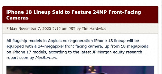 外媒称,如果这份报告属实,那么升级到2400万像素无疑将非常值得关注。这意味着iPhone18、iPhone18Pro、iPhone18ProMax、新一代iPhoneAir以及苹果首款可折叠iPhone将能够拍摄出更清晰、细节更丰富的自拍照片,并提升人像模式的精准度。